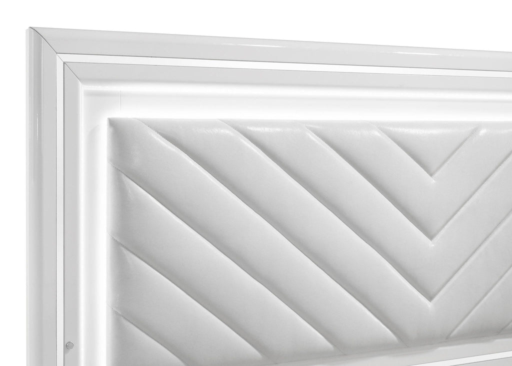 This modern bed showcases a high-gloss white frame paired with a bold LED-lit headboard for striking impact. The panel headboard features a white faux leather insert with chevron channel tufting, framed by a white LED trim that casts soft ambient light. Clean edges and chrome-finished legs enhance its sleek silhouette, while the low footboard keeps the focus on the illuminated design. A foundation is required to complete this stylish bedroom centerpiece.