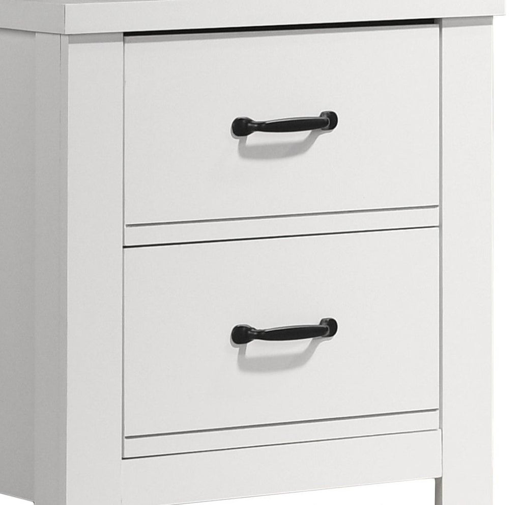 - The elegant and practical Cassini White 2-Drawer Nightstand offers convenient storage and adds a touch of sophistication to your bedroom or living space. With its two drawers, the Cassini Nightstand provides just the right amount of storage for your bedside essentials. These drawers feature sleek black handles that not only make accessing your items effortless but also add a stylish contrast to the white finish. Its clean lines and contemporary design effortlessly blend with various interior styles, from modern to minimalist. With its durable construction and timeless design, this nightstand is a perfect addition to enhance both the functionality and aesthetics of your living space.