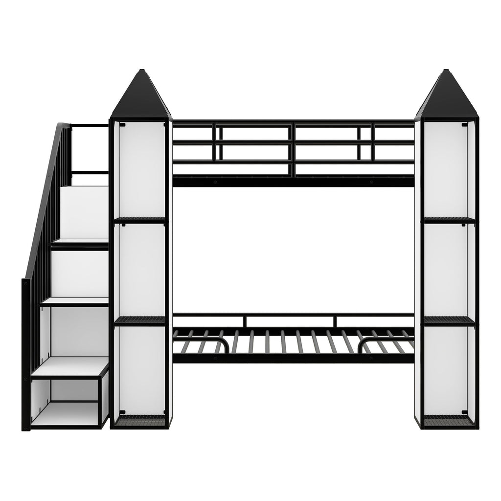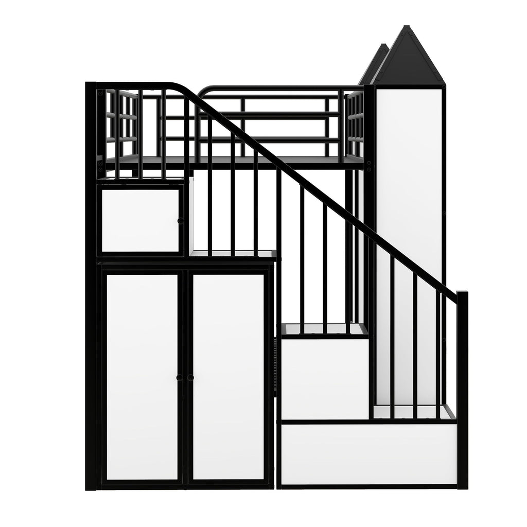Twin Over Twin Castle Shaped Bunk Bed With Wardrobe And Storage - White / Black