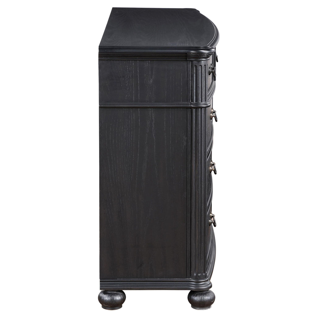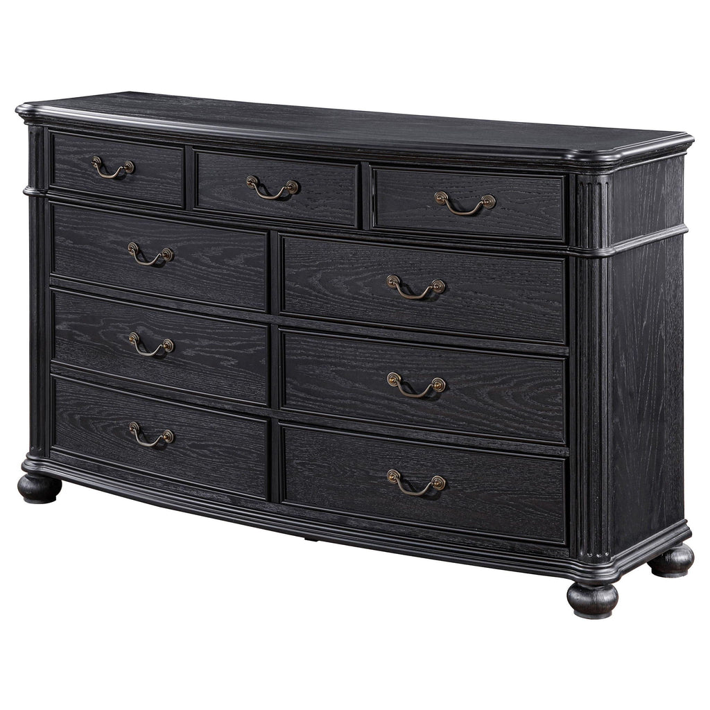 Elevate your bedroom's ambiance with this nine-drawer dresser, a piece that melds classic style with ample storage. The top drawers are felt-lined, offering a soft enclosure for jewelry and treasured items. Each drawer slides out smoothly, allowing for easy organization of your wardrobe. The dresser's substantial presence is accented by a black finish and ornate hardware, creating a statement of sophistication.