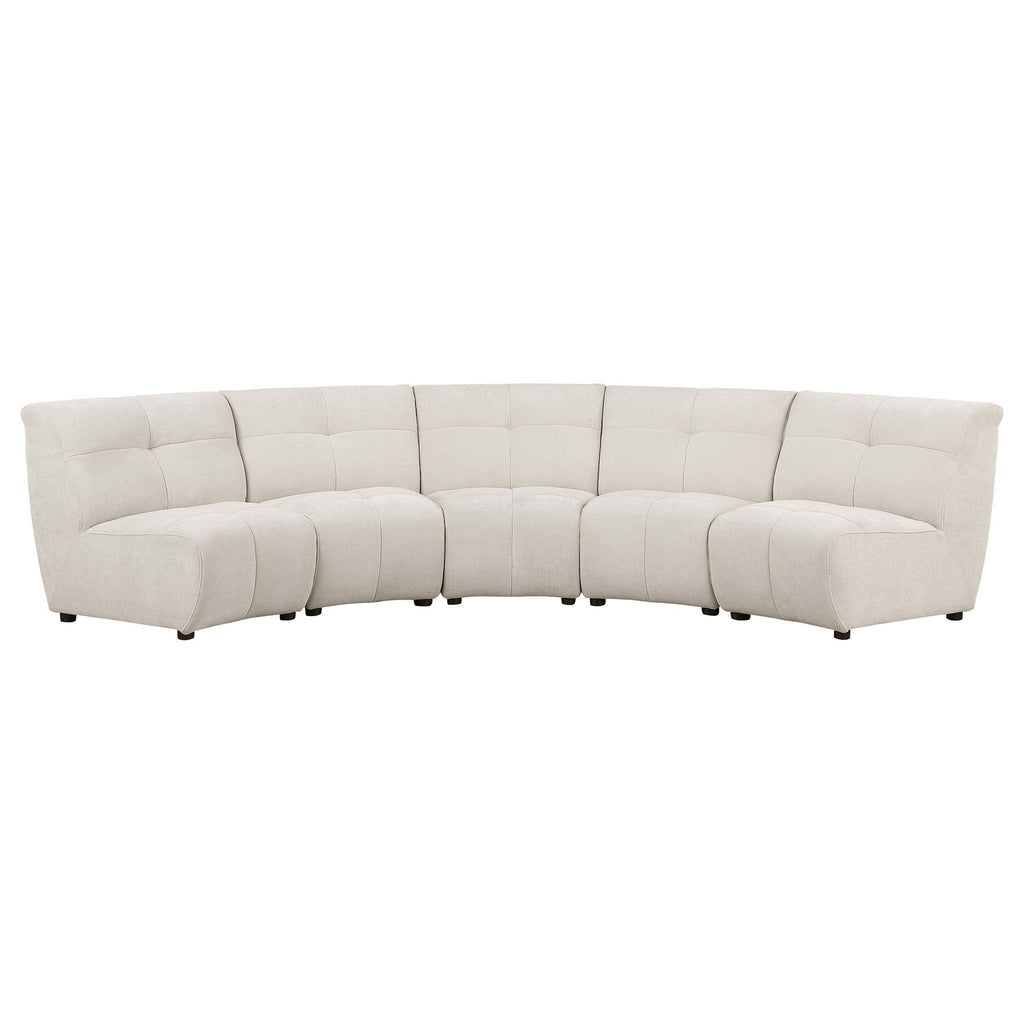 Make a living room or media room the favorite choice for guests and family with a five-piece sectional sofa with minimalism and sophistication woven into its streamlined design. The sectional sofa cuts to the chase with an ultra-comfortable seating experience and subtly rounded profile, perfect for socializing. Durable ivory fabric is soft and inspiring, lending a versatile element to match or coordinate with surrounding décor. This sectional aligns eight armless pieces for a customized configuration and features contemporary design elements with plump, foam-filled framing and decorative tufting adding dimensionality and classic style. A focal point in any space, the sectional sofa accommodates several visitors and adds a low-key, easy motif.