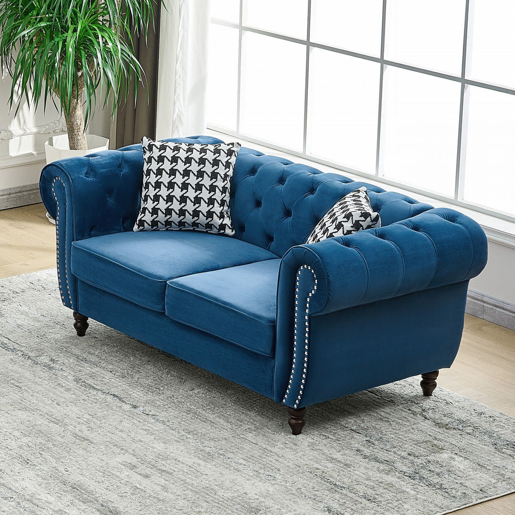 Chesterfield Sofa With Roll Armrest And Nailhead, 2 Seater Couch - Blue