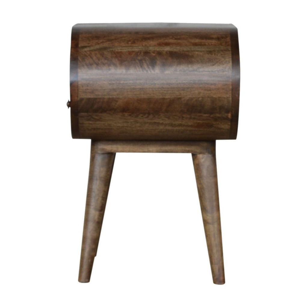 - Circular Open Nightstand - This round style nightstand has been constructed from 100% solid mango wood and has one drawer with an open slot, perfect for storing or displaying any bits and pieces before bedtime. It has been constructed from 100% solid mango wood in a finish allowing its simple design to be partnered with any styles or finishes of furniture.