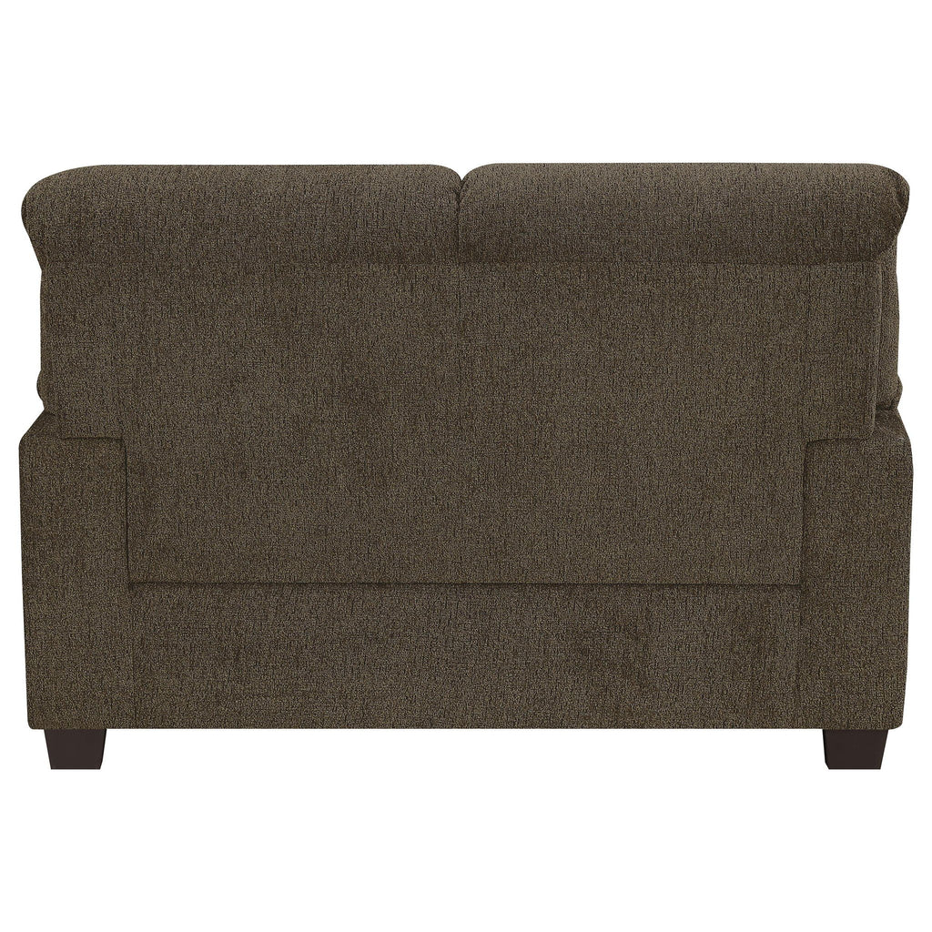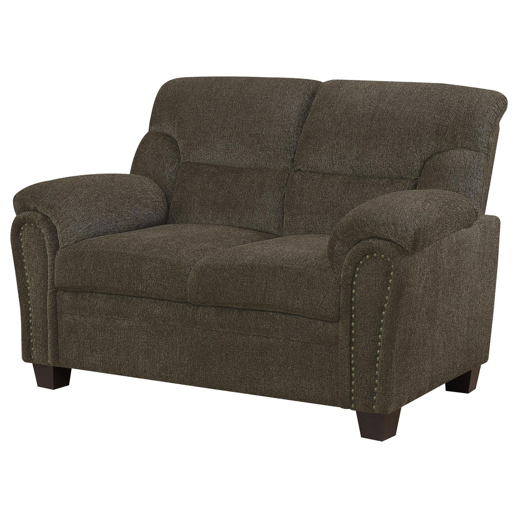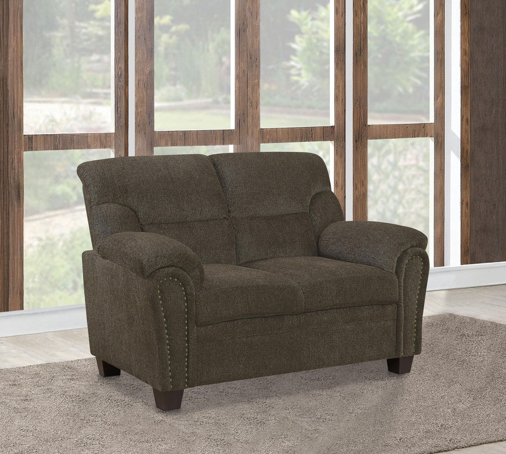 This chic, elegant loveseat pulls a room together in style. Its arms boast a graceful, curved silhouette embellished with cool nailhead trim along the front. Its supportive back is pleasingly accentuated by glamorous tufted stitching. Gently tapered wooden legs complete its classic design. Combined with a matching sofa or placed on its own, this loveseat is ideal for any living space.