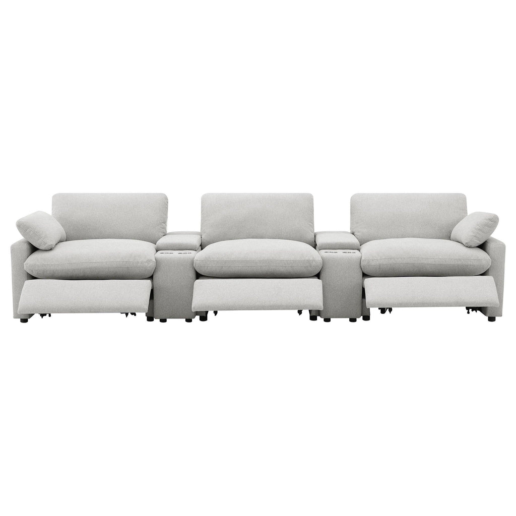 This three-seat home theater seating set combines modern convenience with plush comfort. Each power recliner offers smooth adjustability, while two center consoles feature lift-top storage and dual stainless steel cup holders. Upholstered in soft fabric, the generously padded cushions and pillow-top armrests enhance relaxation. Built for durability and long-lasting support, this seating arrangement is perfect for creating a cozy entertainment space.