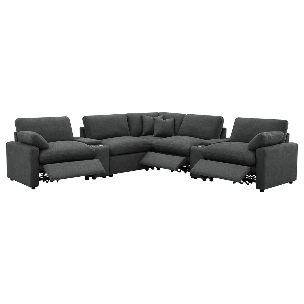Transform your living space with the versatile modular sectional, designed to offer a perfect blend of comfort, style, and customization. This sectional features three power reclining pieces and two non-reclining pieces, allowing you to create your ideal seating environment. With the option to add additional power or non-power armless chairs, you can customize the layout to suit your room and preferences. Enjoy the plush comfort of premium down-like filled cushions and a sleek, modern design that enhances any decor. Experience the ultimate in relaxation with the power reclining pieces, featuring a 4-inch wall-hugging design for full recline without needing excessive space.