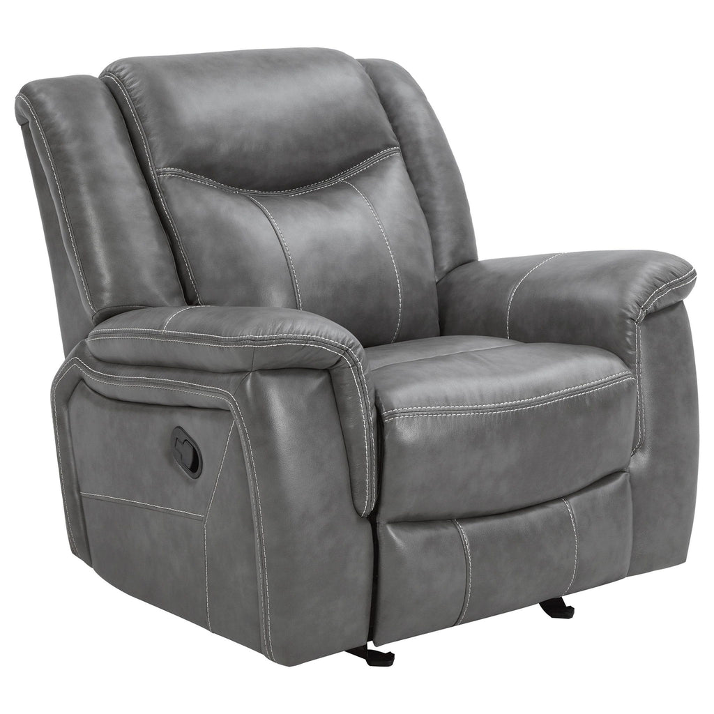 Enjoy superior comfort and smooth motion with this glider recliner chair upholstered in sleek grey faux leather. Designed for everyday relaxation, it features plush padding, overstuffed armrests, and a supportive headrest that enhances lounging comfort. The ergonomic side lever allows quick and easy reclining adjustment, while pocket coil seating and a one-inch cool gel memory foam topper provide exceptional support. Combining luxury and practicality, this recliner delivers the perfect balance of modern design and relaxation.