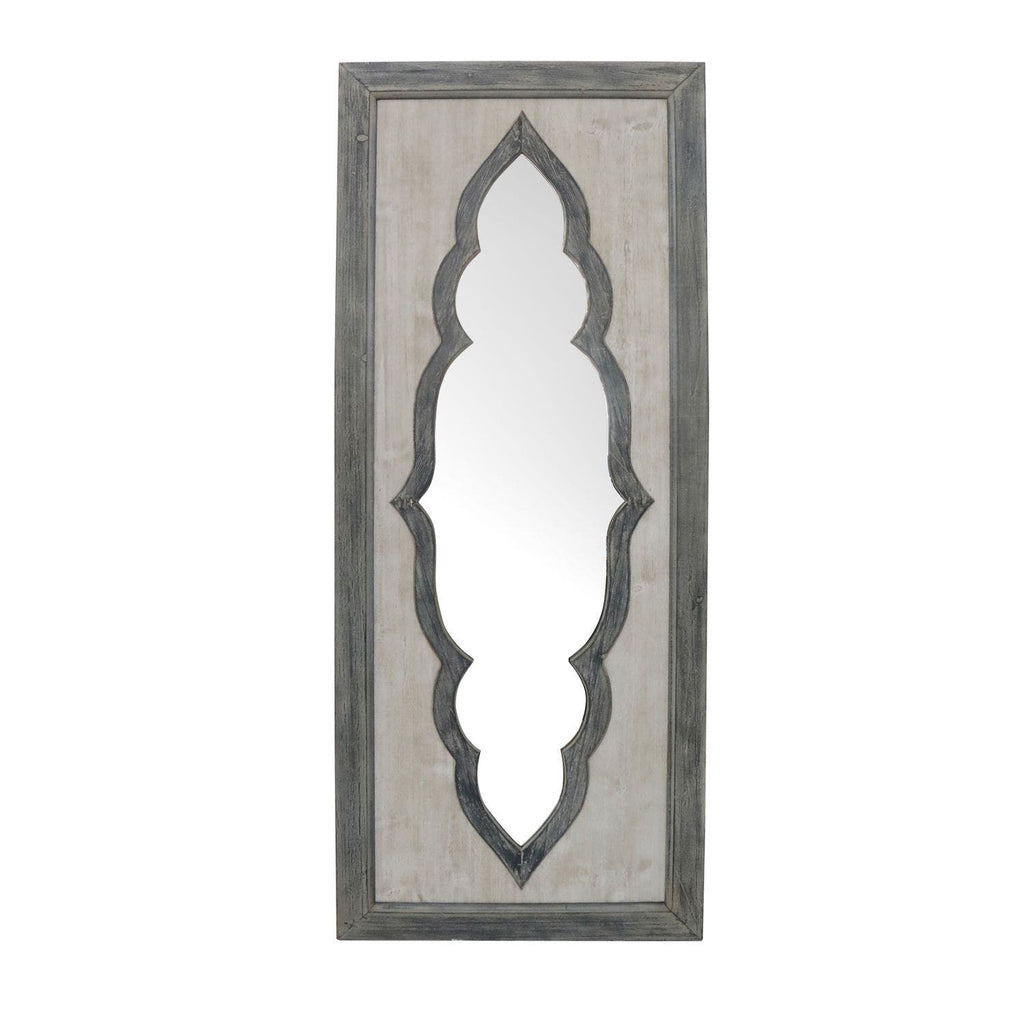 The Crestview Collection Contouring Mirror is light grey wood with dark grey framing around the border of both the rectangular piece and the center mirror. The mirror is shaped in a scalloped, middle-eastern motif bringing both transitional and rustic style to your decor. The outer dimensions are 19-inches x 47.25-inches. Your room will be reflected in the glass and appear bigger and more lit up with the addition of this piece.