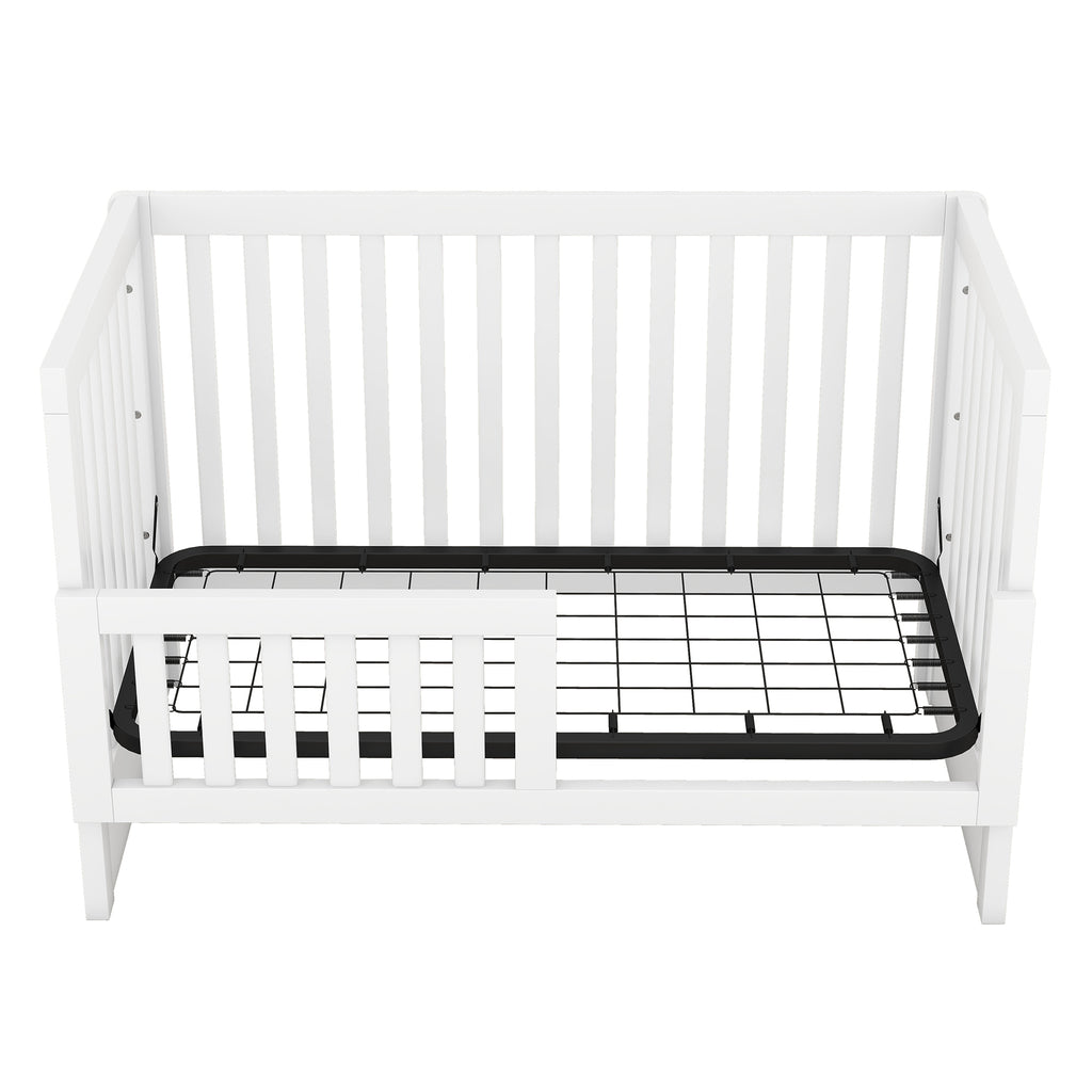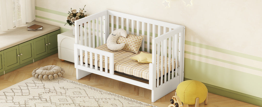 - [Adjustble Height and Guardrails] This bed with adjustable height mattress support with 3 positions to grow with your baby. Crib uses a standard size crib mattress support to ensure a perfect fit. A full length guardrail and semi-close guardrail are included for your choice.