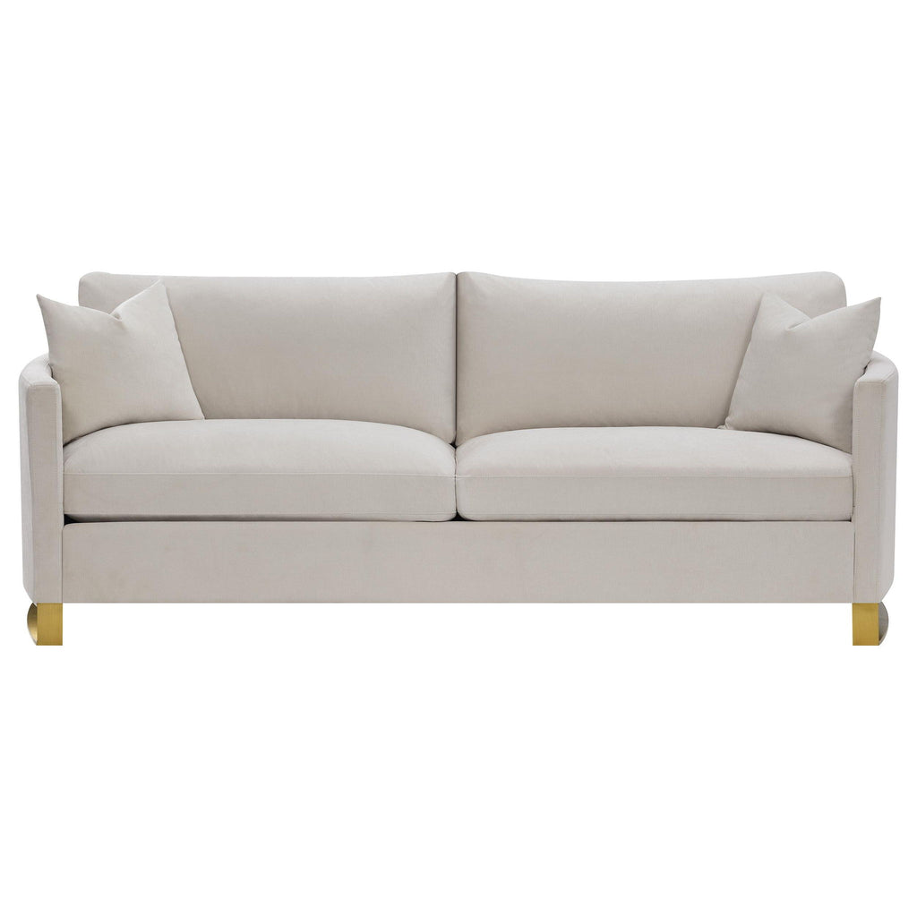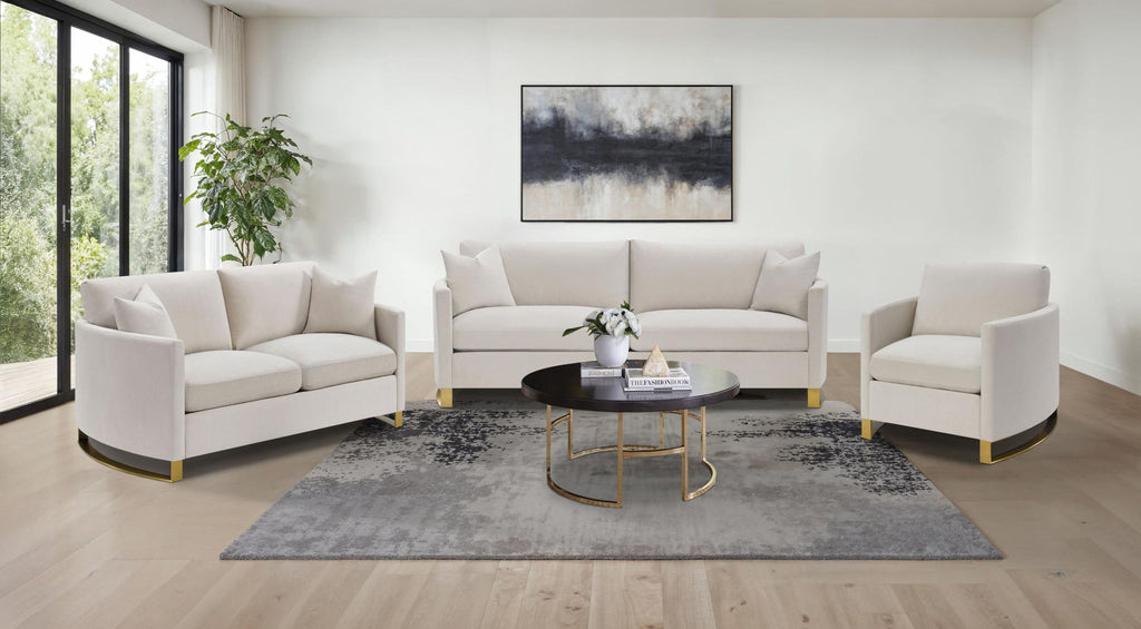 Fresh inspiration marks the start of a stylish, custom room design that begins with this living room set. Modern and contemporary with a softening effect that works in transitional spaces, this set delivers a versatile aesthetic with textured beige velvet upholstery and a surprising twist creating elegance in metal leg units crafted from gorgeous gold stainless steel. Arched sides add character to this set that offers supreme lounging comfort on reversible feather blend cushion seats and sinuous spring deck and webbed backing. Make this set a focal point in a casual, sophisticated space reserved for family and guest entertainment. Includes two accent pillows for each piece.