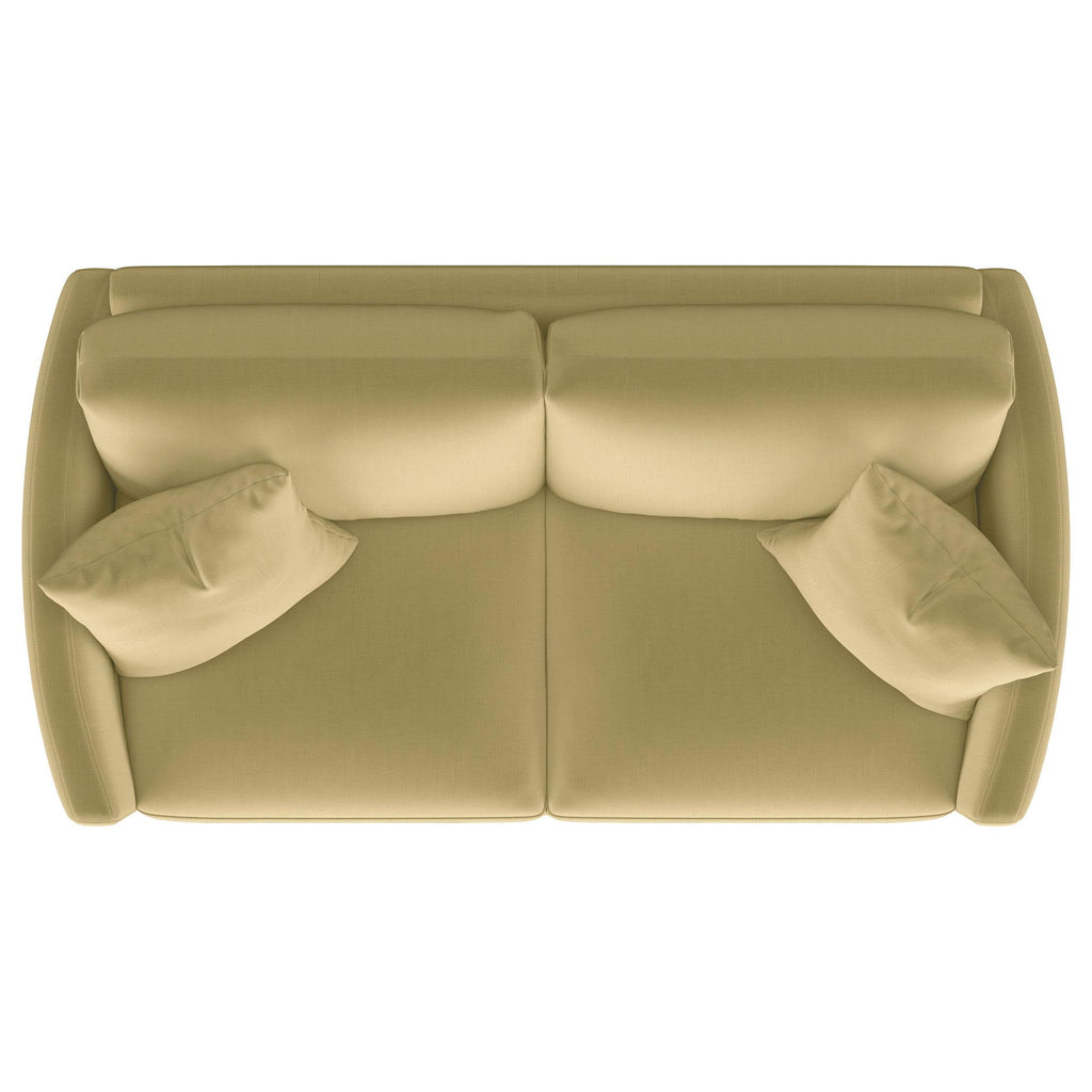Indulge in opulent comfort with this textured velvet loveseat. Its reversible feather blend seat and back cushions, complemented by curved arms and gold stainless steel legs. Smooth upholstery and lustrous details blend simplicity with timeless splendor, making this piece a perfect focal point for refined interiors. With its inviting profile and graceful presence, it elevates both style and relaxation.