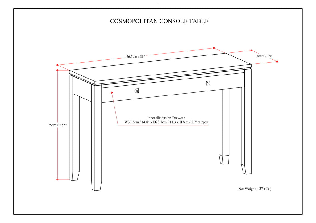 38.0"W x 15.0"D x 29.5"H - 26.9 lb