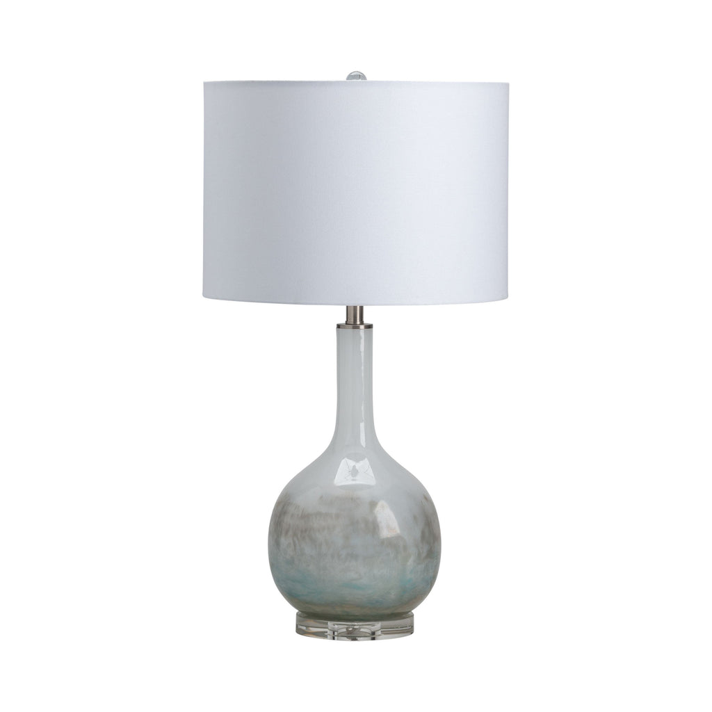 The Crestview Collection Coutler Bottle Table Lamp will bring a magical feel to your home with its potion bottle-shaped body. Made of glass and sitting atop a crystal base, this table lamp features a beautiful iridescent blue and white finish. A white linen drum shade enhances the summer day sky look.