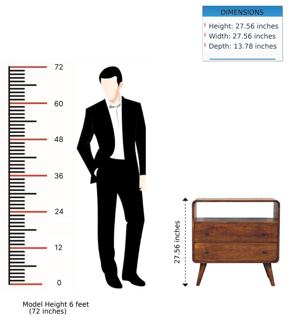 - Console Curved Nordic Charm Artisan Furniture - This sleek console table is crafted from 100% Solid Mango Wood and finished in a warm Chestnut tone, showcasing its natural grain patterns. The design features two compact drawers with subtle brass black knobs, offering convenient storage, while the open shelf provides space for decor or essentials. The curved edges and Nordic-style legs lend a mid-century modern aesthetic, making it a stylish addition to living rooms, hallways, or bedrooms. Combining functionality with elegance, this piece elevates any space with its timeless design.