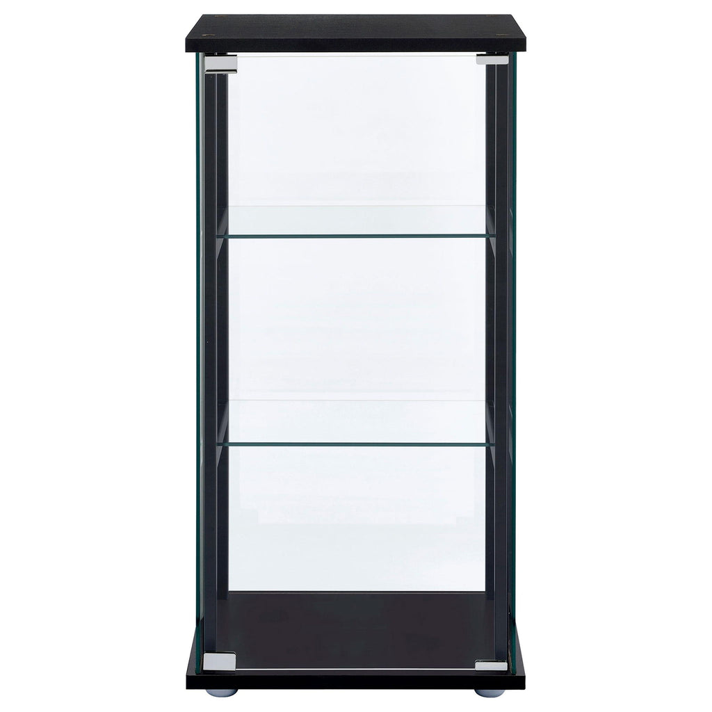 A modern version of a true classic makes a fabulous addition to a transitional space. With linear styling and a fresh look, this curio cabinet offers a perfect venue for showcasing treasured decor. Bold black tops a simple frame, top, and base. Tempered glass shelves create transparent space for display. Access its interior easily with push-to-open doors.
