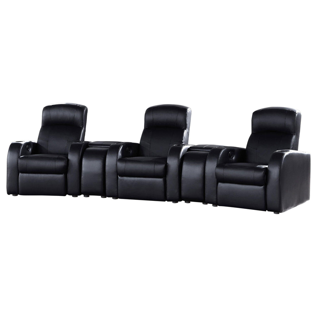 Experience cinematic luxury at home with this sleek home theater seating collection. Each recliner is upholstered in smooth black top grain leather everywhere the body touches, offering both elegance and durability. Designed with high backs, supportive pocket coil seating, and wall-hugger mechanisms, the recliners maximize comfort and save space. Built-in cupholders provide convenience, while optional wedge consoles add soft-closing storage for remotes and accessories. Modern stitching and rounded track arms complete the refined look, making this collection the ultimate in home entertainment seating.