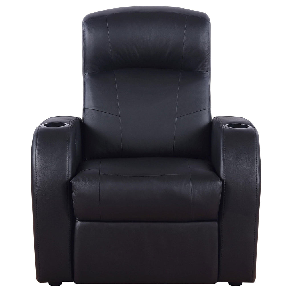 Experience cinematic luxury at home with this sleek home theater seating collection. Each recliner is upholstered in smooth black top grain leather everywhere the body touches, offering both elegance and durability. Designed with high backs, supportive pocket coil seating, and wall-hugger mechanisms, the recliners maximize comfort and save space. Built-in cupholders provide convenience, while optional wedge consoles add soft-closing storage for remotes and accessories. Modern stitching and rounded track arms complete the refined look, making this collection the ultimate in home entertainment seating.