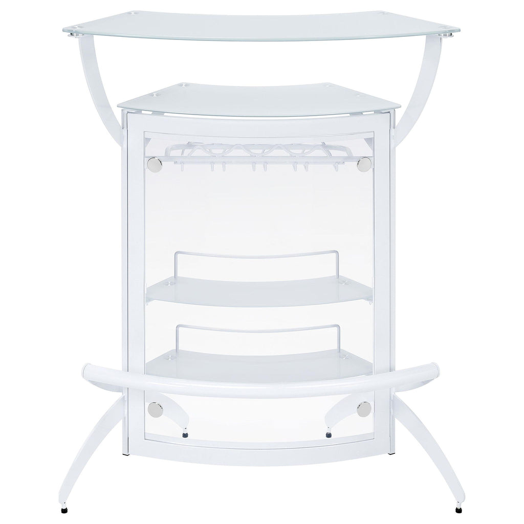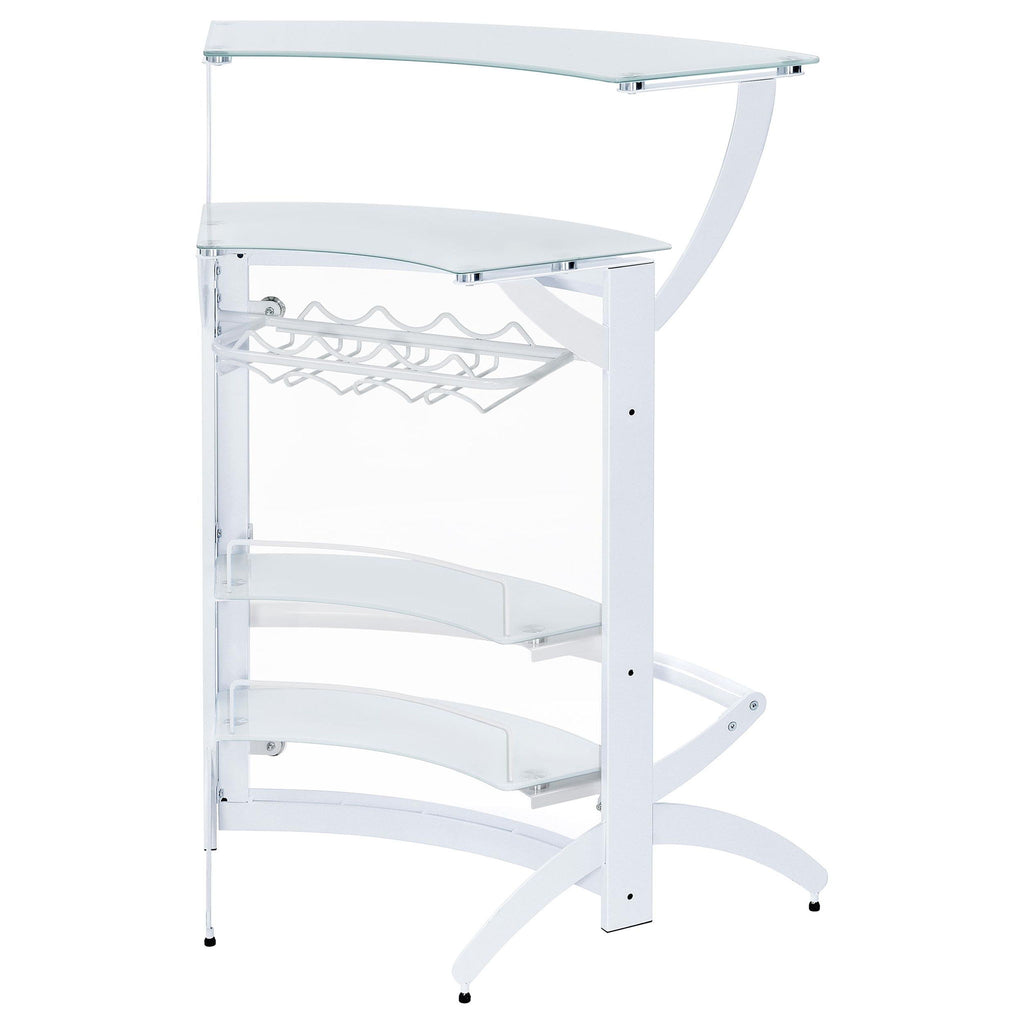 A sleek curved silhouette delivers a functional and aesthetic boost to this home bar unit, a great choice for fulfilling your casual entertainment needs. A modular motif fits the most custom contemporary design schemes, making it simple to host guests or family. White acrylic and glass construction stands out in any setting. A spacious exterior upper shelf is perfect for drink or snack prep, as a rack housed behind a glass door makes room for stemware and interior shelves store more bottles. Dressed up with mirror case trim and a mirrored case top shelf, it creates a glam influence with extra sparkle.