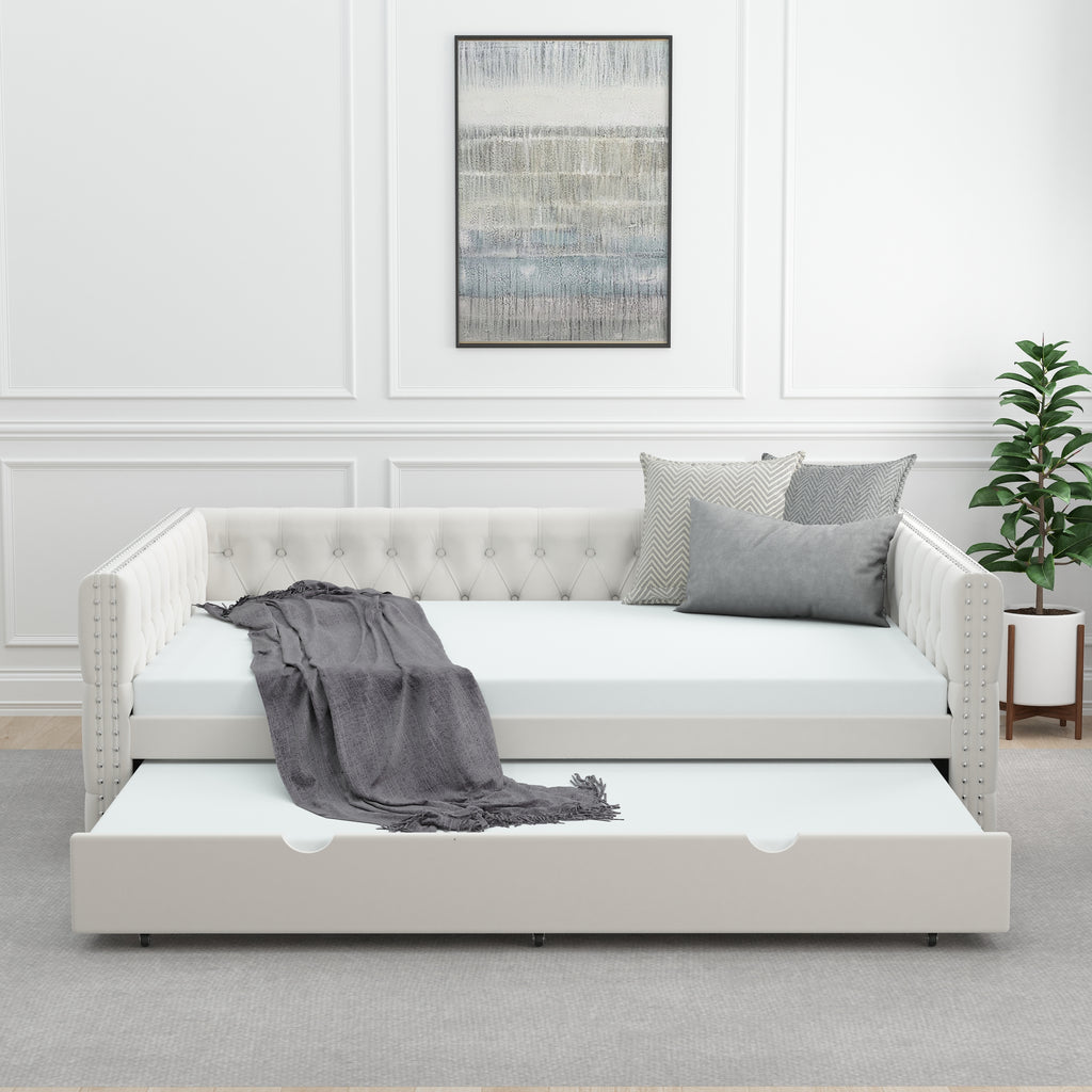 - [Functional Daybed/Sofa Bed]Pull-out twin size trundle with caster for easy access. This daybed can be used as a sofa, living room bed and guest bed. Multi-purpose use in a variety of rooms and spaces, such as kids, dorms and guest bedrooms for small living spaces and accommodating guests.