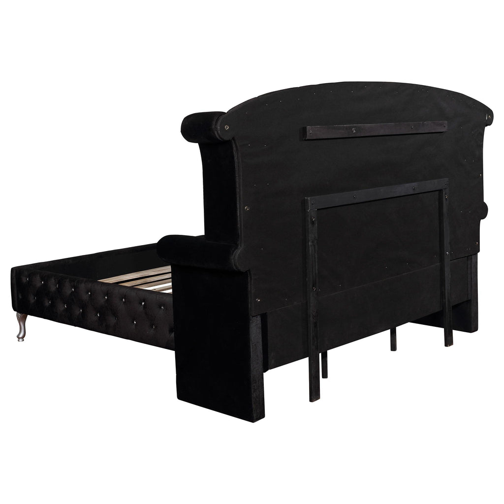 With its striking design, this California king bed creates a luxe, glamorous aesthetic in a master suite. Its graceful silhouette is enhanced by the sophisticated flair of elegant button tufting. Its beautiful, black upholstery is brought to life by stunning, metallic accents. Delicate, tapered legs with a shiny, silvery finish complete its opulent look. This exquisite bed adds a posh, upscale vibes to any modern bedroom.