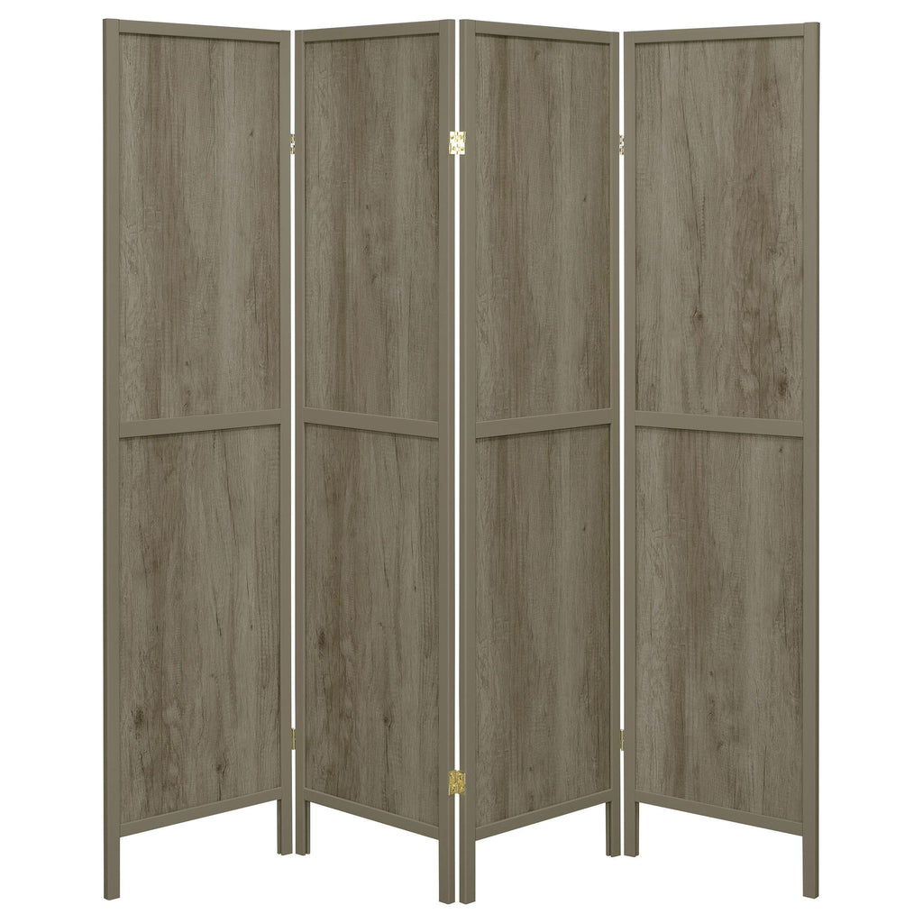 This four-panel folding screen adds privacy and visual interest to any space. Designed with clean lines, it features solid wood-inspired panels framed by a sturdy structure that highlights its modern yet rustic appeal. Hinged panels allow versatile positioning, whether fully extended or angled to suit your needs. Constructed from engineered wood, laminate veneer, and solid pine, this piece offers lasting durability while providing a stylish solution for dividing or accenting open areas.