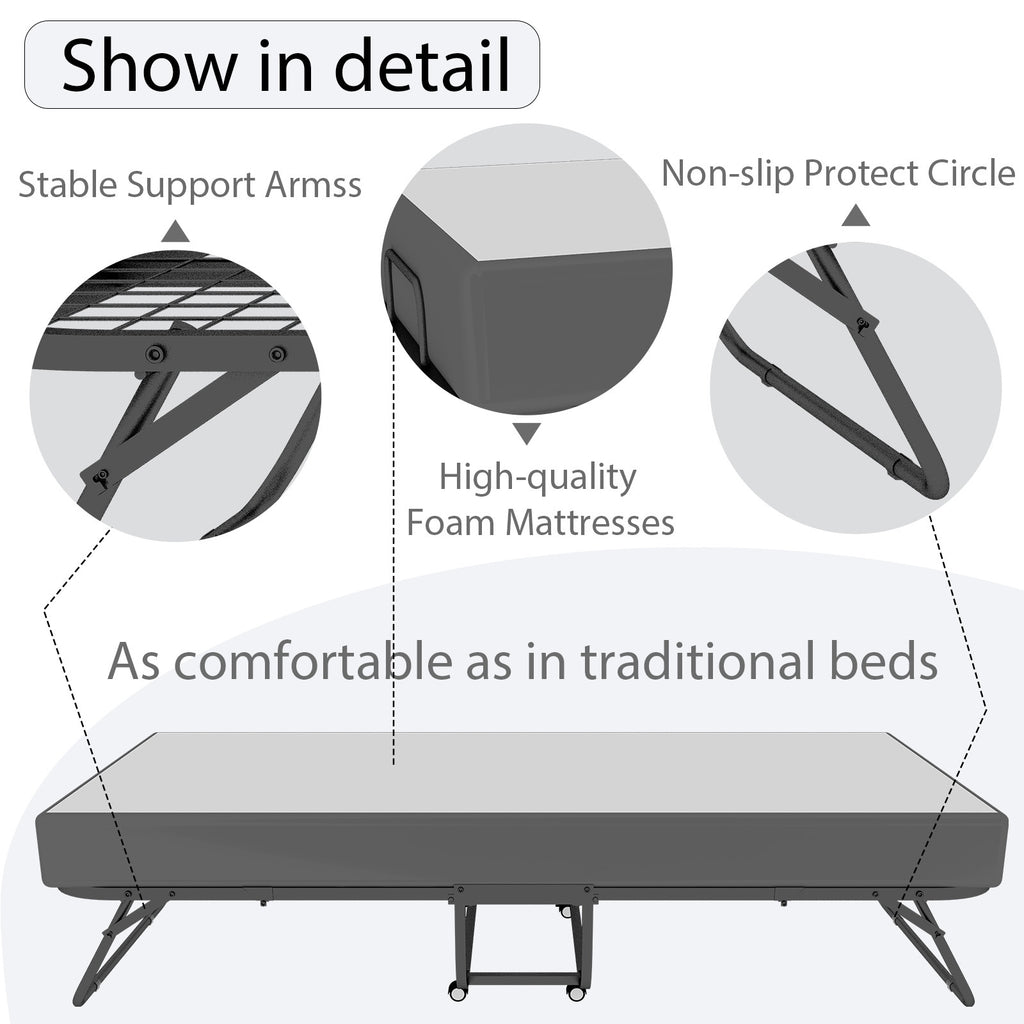 - easy transportation and storage: enjoy the convenience of a portable bed that folds into a slim profile, equipped with smooth wheels , ideal for camping beds for adults or as a trifold mattress in your home