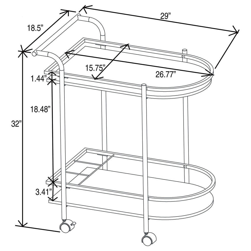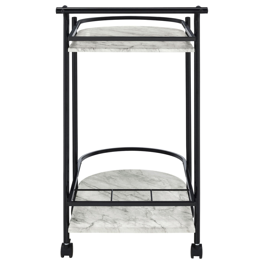 Invite guests over for an intimate soiree and serve up cocktails on this contemporary bar cart. Classic faux white marble shelves stack on top of one another, lending a traditional approach to its sleek modern silhouette. Rounded edges on one side add to the graceful appeal of the elongated shape. Designed in a metal frame with slim railing all around to keep bottles in place, this bar cart is ready to glide across floors. Lockable rolling casters secure it in place.