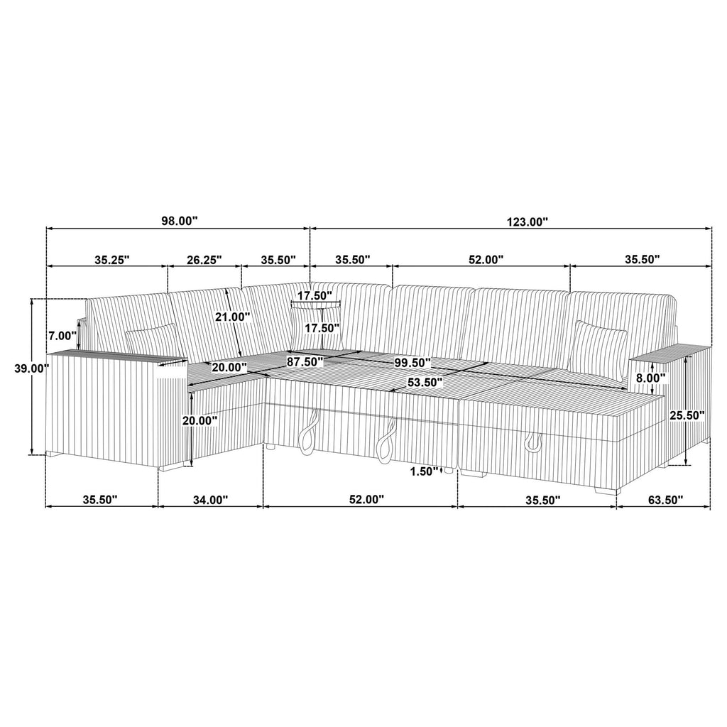 This versatile corduroy sleeper sectional effortlessly converts from cozy seating to a comfortable guest bed with its pop-up sleep surface. A spacious storage chaise keeps essentials at hand, while plush upholstery and three matching pillows provide lasting comfort and style. Its neutral tone complements any décor, making this piece an ideal centerpiece for relaxation, entertainment, and accommodating overnight guests. Built for durability, it seamlessly blends form, function, and modern appeal.