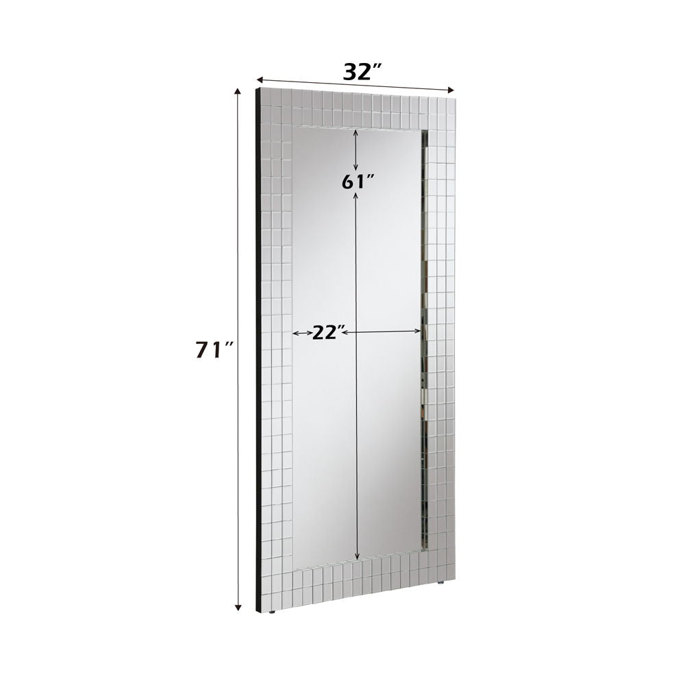 Get the Dominic collection accent floor mirror to your living area with its stunning mosaic style frame. This full length mirror not only enhances the decor but also provides a practical reflection for any space. Its intricate design and reflective surface create a focal point that complements modern and contemporary interiors. Transform your living area or bedroom with the sophisticated charm of the Dominic mirror.