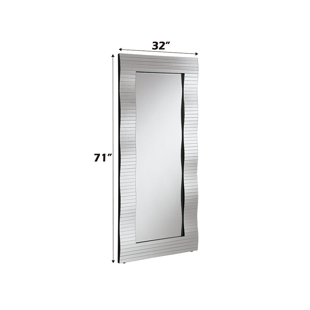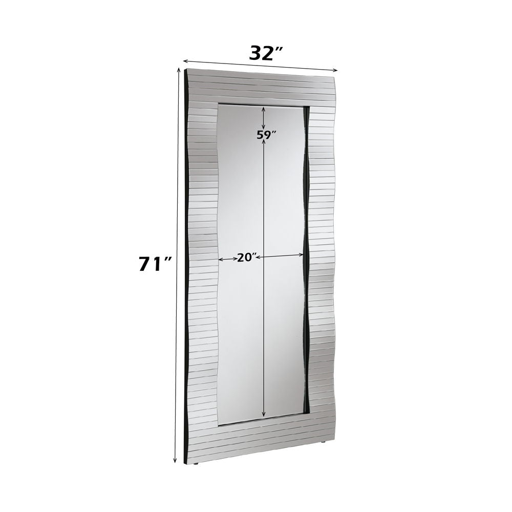 Get the Dominic collection accent floor mirror to your living area with its stunning mosaic style frame. This full length mirror not only enhances the decor but also provides a practical reflection for any space. Its intricate design and reflective surface create a focal point that complements modern and contemporary interiors. Transform your living area or bedroom with the sophisticated charm of the Dominic mirror.