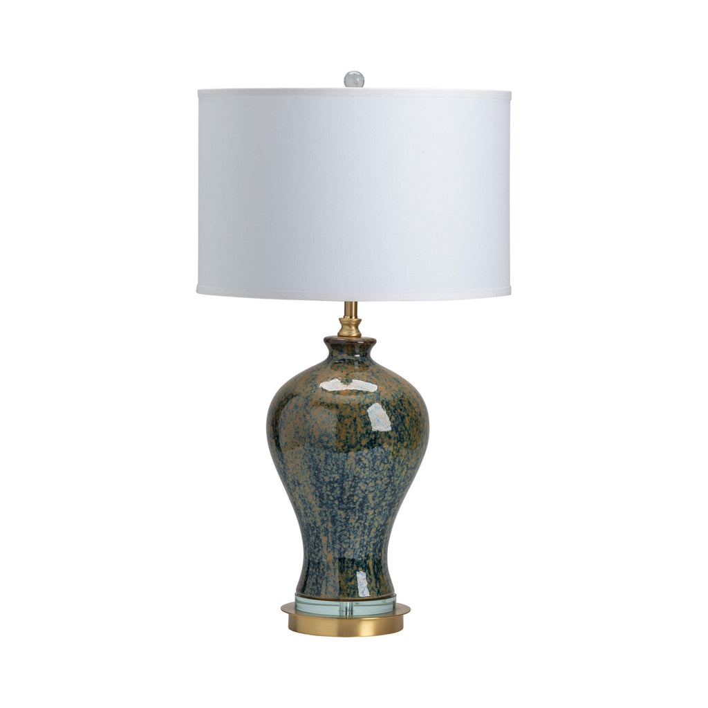 The Crestview Collection Draper Urn Table Lamp will bring a rich, warm feeling to your home. A glossy, reactive glaze of emerald green and gold gives the ceramic body an artistic look. The base features a crystal slab stacked on top of a brushed brass platform. A crisp, white drum shade makes this decorative lamp stand out.