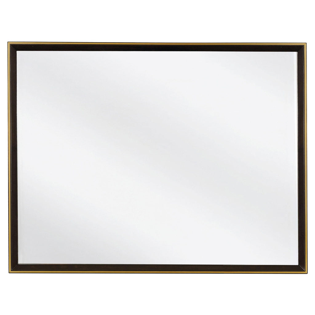 Modern and geometric, this eastern king five-piece bedroom set creates a beautiful visual. Add depth and warmth with the smoked peppercorn finish from the high upholstered headboard. Complete with a nine-drawer dresser, two-dresser nightstand and shelf, and two-drawer chest with doors, this set is versatile and streamlined. Retro inspired details offer structure and personality. The streamlined mirror looks great over the tall dresser.