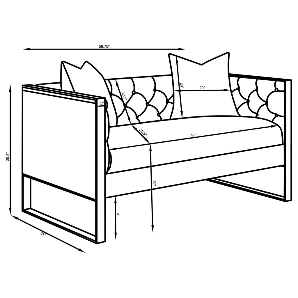 You'll love the contrast of tones and materials in this modern two-tone loveseat, but it's the cozy comfort that will leave you hooked. The button tufted velvet upholstery comes in an elegant light grey finish that's soft to the touch. Two throw pillows are included for your next restful lull. Then there's the gold stainless steel base that wraps around the arms and forms U-shaped legs. The mix of gold and grey with the blend of metal and soft fabric makes this loveseat a feast for the senses.