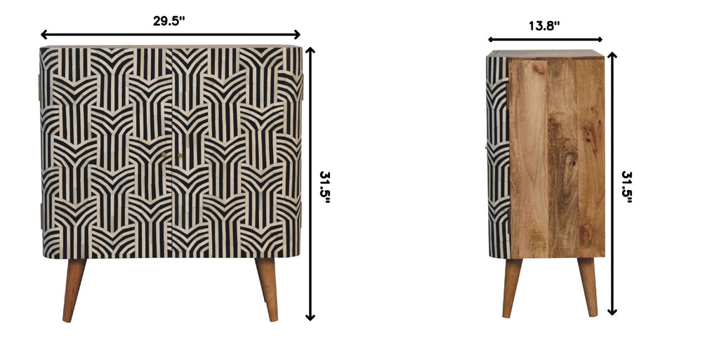 - Artisan Furniture Solid Wood Edessa Bone Inlay Cabinet - This beautiful boho inspired cabinet has been constructed from 100% solid mango wood and has a finish. Other features include bone inlay front doors, and Nordic style legs. The bone inlay is sourced responsibly from deceased animals such as camels, goats, and buffaloes.