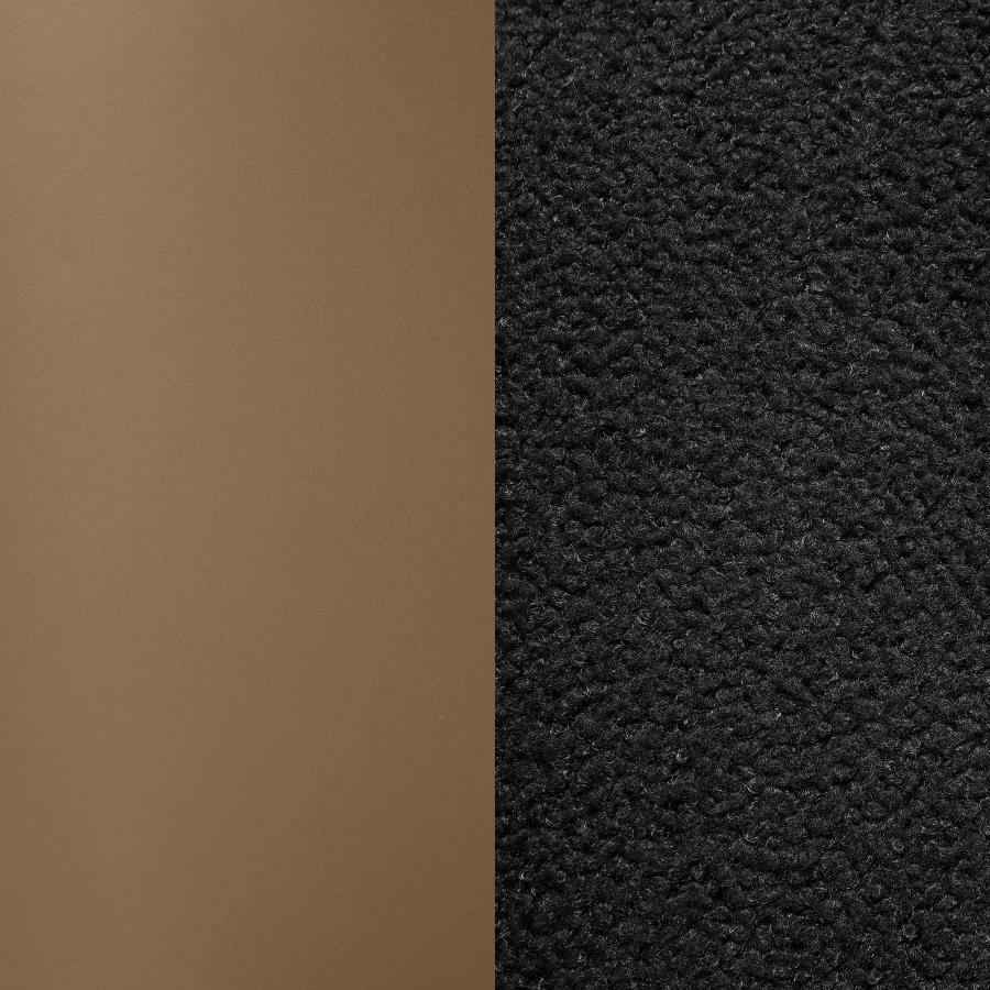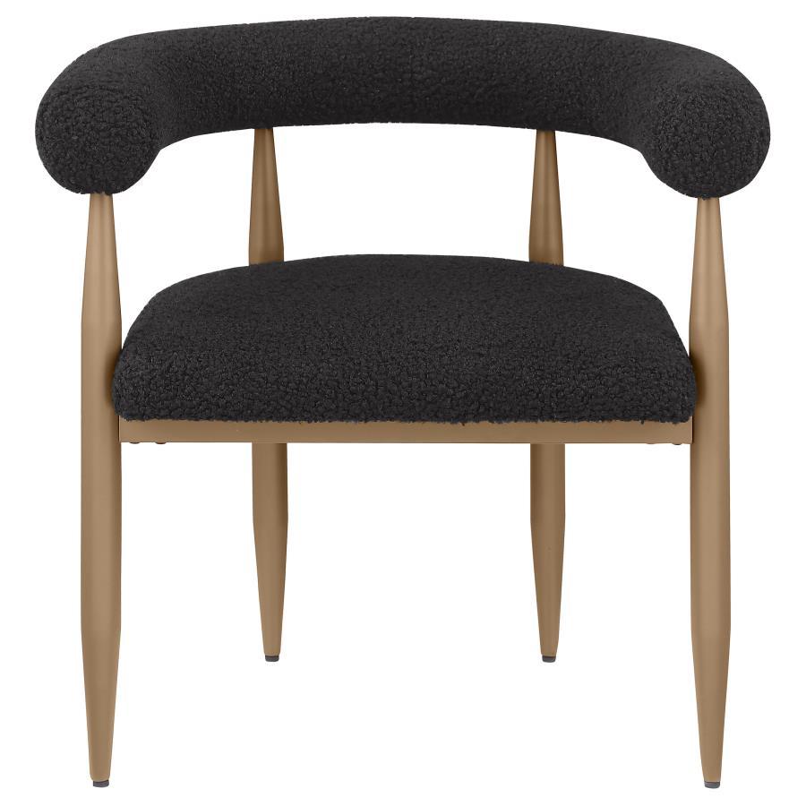 Sinuous curves bring unified style and sophistication to the table and chairs in this five-piece modern dining set. It delivers a stylish rectangular table complete with a sculpted base in a warm, rich bronze finish. The tabletop is black finish glass, adding cool, glossy elegance. Chairs feature U-shaped backrests and plush seats, both with foam padding and textured black boucle upholstery. Tapering legs in a matching bronze finish complete the chairs and create a sense of cohesion for the set.