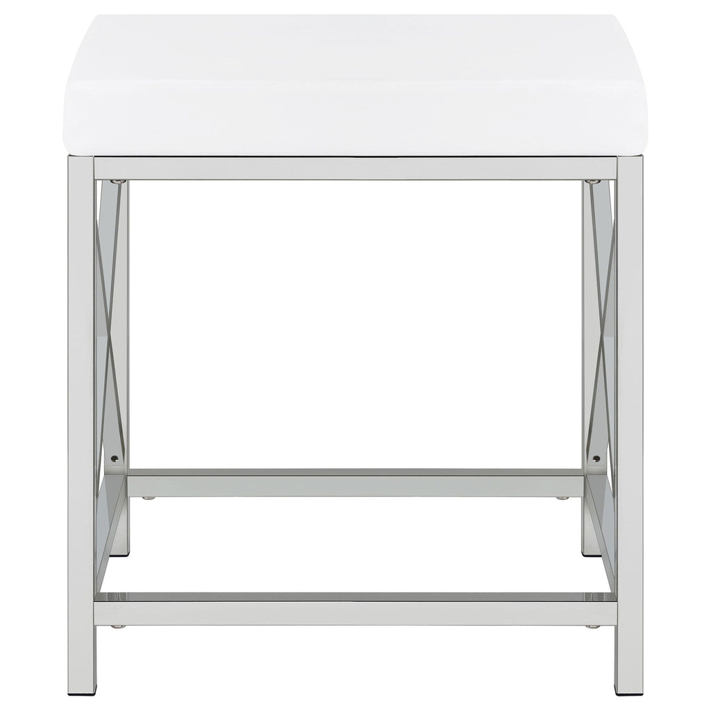 Elevate your morning rituals with a compact, contemporary vanity set, including table, mirror and stool. Perfect for makeup and hair, the vanity shows off a bright white finish with a large drawer for stashing your daily necessities. On top, a lighted mirror adds Hollywood glamour while providing bright illumination so you can see every detail as you get ready for everything from running errands to a girl's night out. The desk is accompanied by a backless stool, providing an easy spot to sit as you prepare for the day. The stool features a base with X-shaped braces to match the desk and includes a white faux leather seat with lovely padding that starts your day on the right foot.