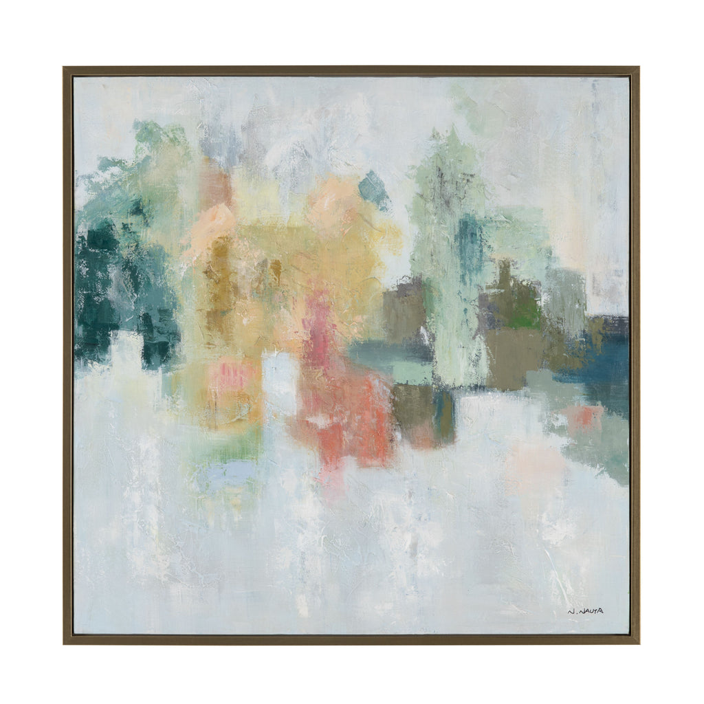 The Crestview Collection Emeralds Hand-painted Framed Canvas features rich shades of green, yellow and pink contrasted with the muted gray background. This colorful piece is hand-painted on canvas. A thin, gold frame complements this striking piece. This transitional image measures 41-inches x 41-inches square.