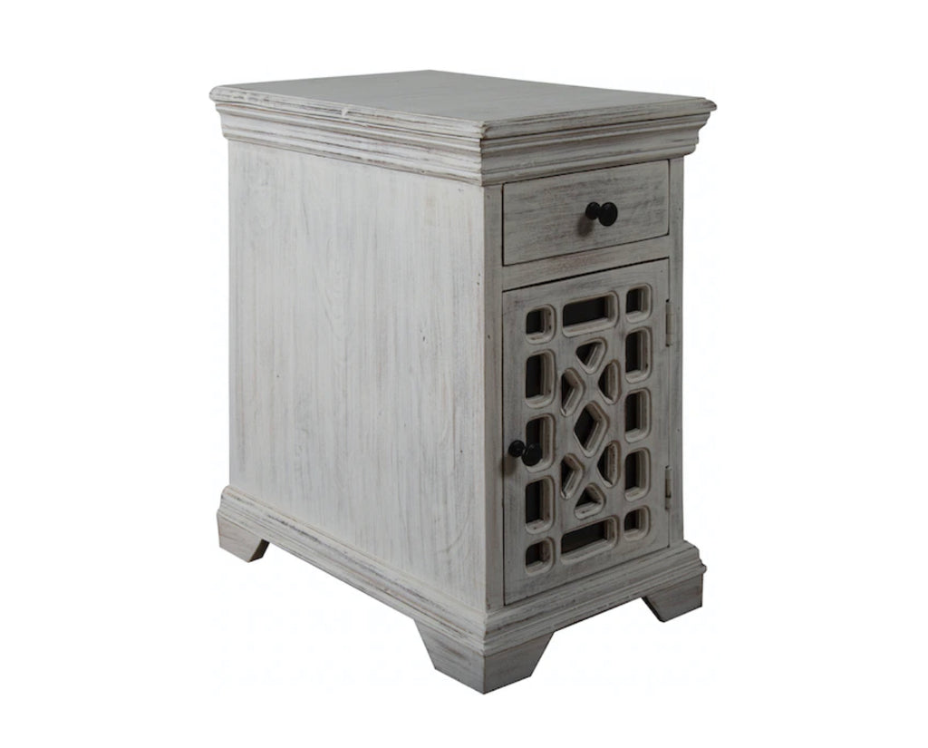 Solid wood end table. Distressed Grey. Glass on the front door.