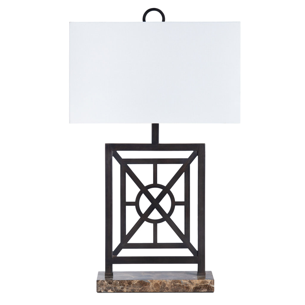 Inspired by the wrought iron treillage of the New Orleans French Quarter, the Crestview Collection Englewood Lamp is composed of an aged iron architectural element mounted on a slab of rich brown marble. Topped by a crisp white linen shade it is a classic in any era.