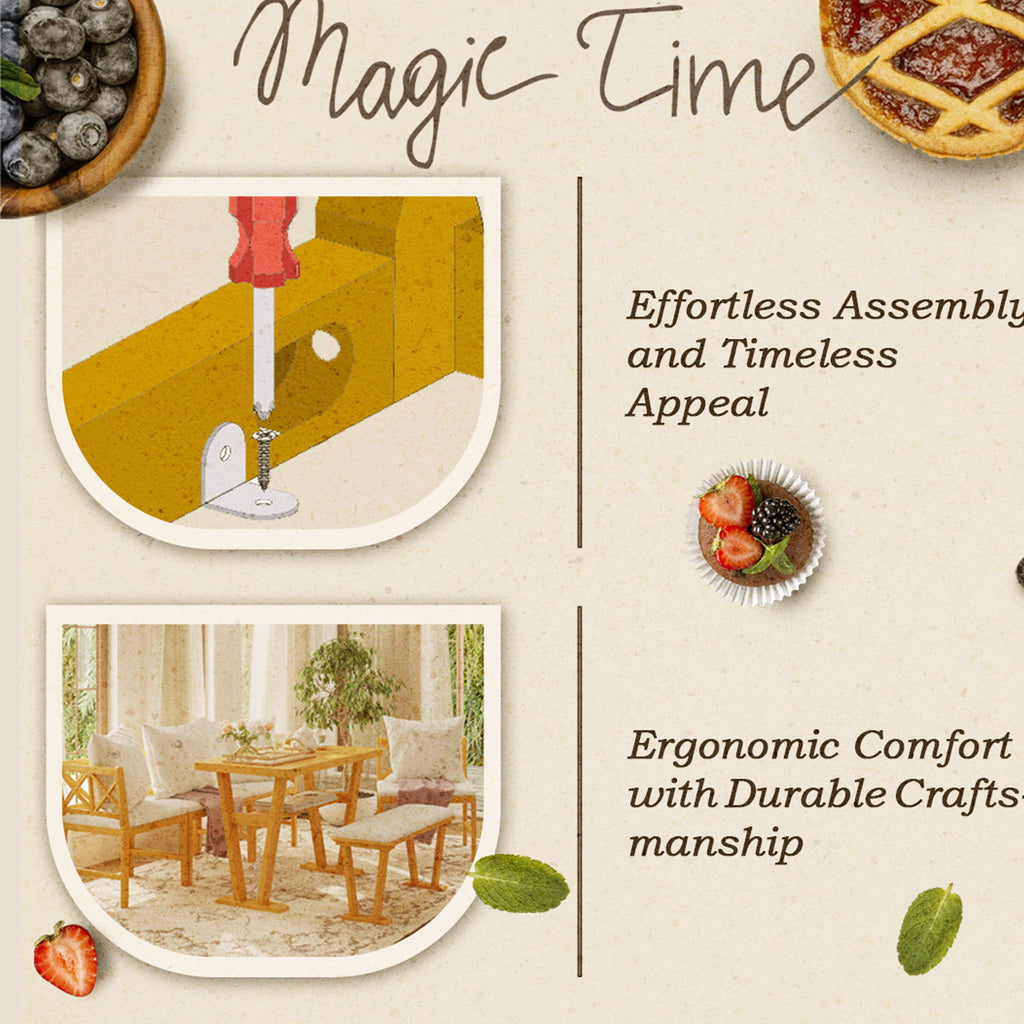 - Comfortable Seating for 4-6: Includes 2 corner armchairs, 2 standard chairs, and 1 soft padded bench for cozy dining.