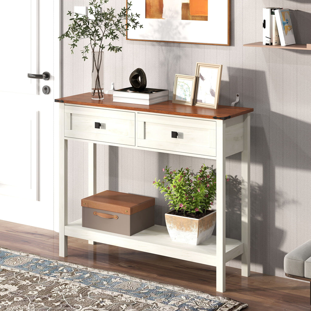 Farmhouse Style Console Table With 2 Drawers And Bottom Storage Shelf - Antique White