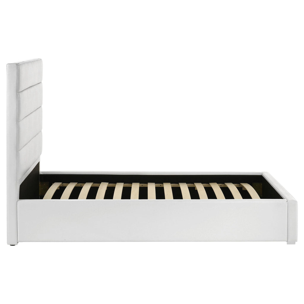 Elevate your bedroom with this modern upholstered bed featuring clean lines and a minimalist design. Wrapped in white faux leather, the panel headboard showcases horizontal channeling for a sleek and contemporary look. The sturdy frame includes slat support, eliminating the need for a box spring while ensuring mattress stability. Crafted from durable materials, this bed combines engineered wood and metal for lasting reliability. Perfect for creating a crisp, modern ambiance in any bedroom.