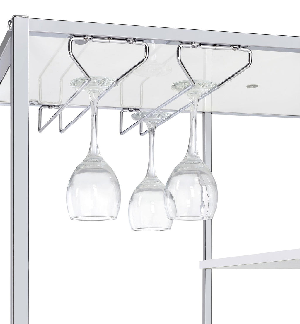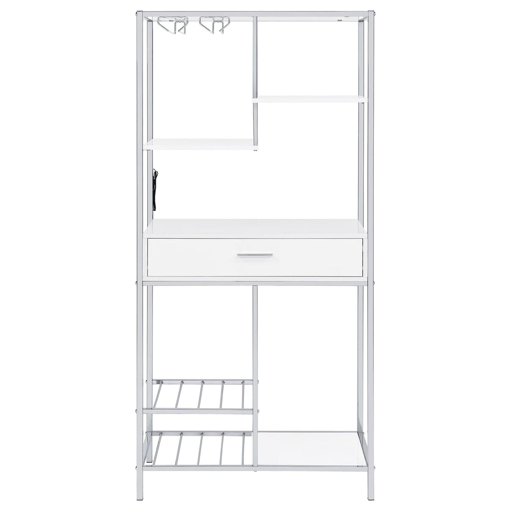 A modular design with integrated LED lighting offers a fresh, modern look, perfect for hosting guests in your contemporary setting. This wine cabinet features a minimalist and linear design with four open shelves, a convenient pull-out drawer, two tiers of wine bottle storage, and integrated stemware racks. Constructed from engineered wood in a white high-gloss, scratch-resistant finish, it is complemented by a sleek silver-finished rectangular frame. Combining style and functionality, it’s an ideal choice for serving and entertaining.