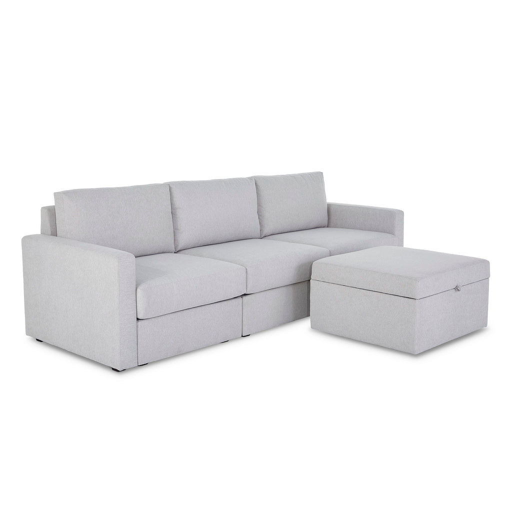 Designed for a lifetime of flexibility, the Flex sofa with ottoman makes the perfect gathering spot for relaxing and the ottoman can be a standalone piece or pushed up against one end to make a chaise lounge. Easily expand and reconfigure the sofa as needs change. Built with Blue Steel Spring technology and sustainable stain-resistant performance fabric, the Flex sofa provides deep-seated, blissful comfort and long-lasting durability. And assembly is a breeze with a patented J-bracket “no-tool” method that takes minutes, rather than hours.