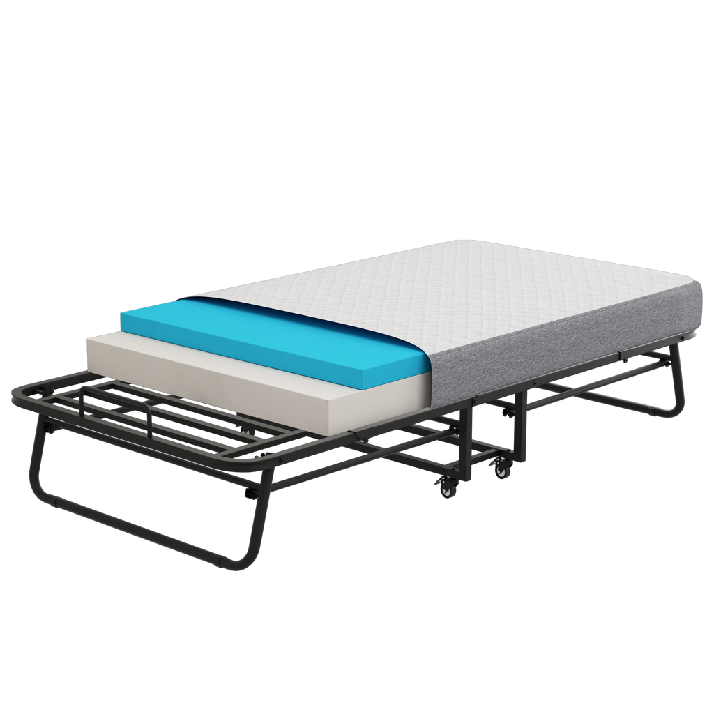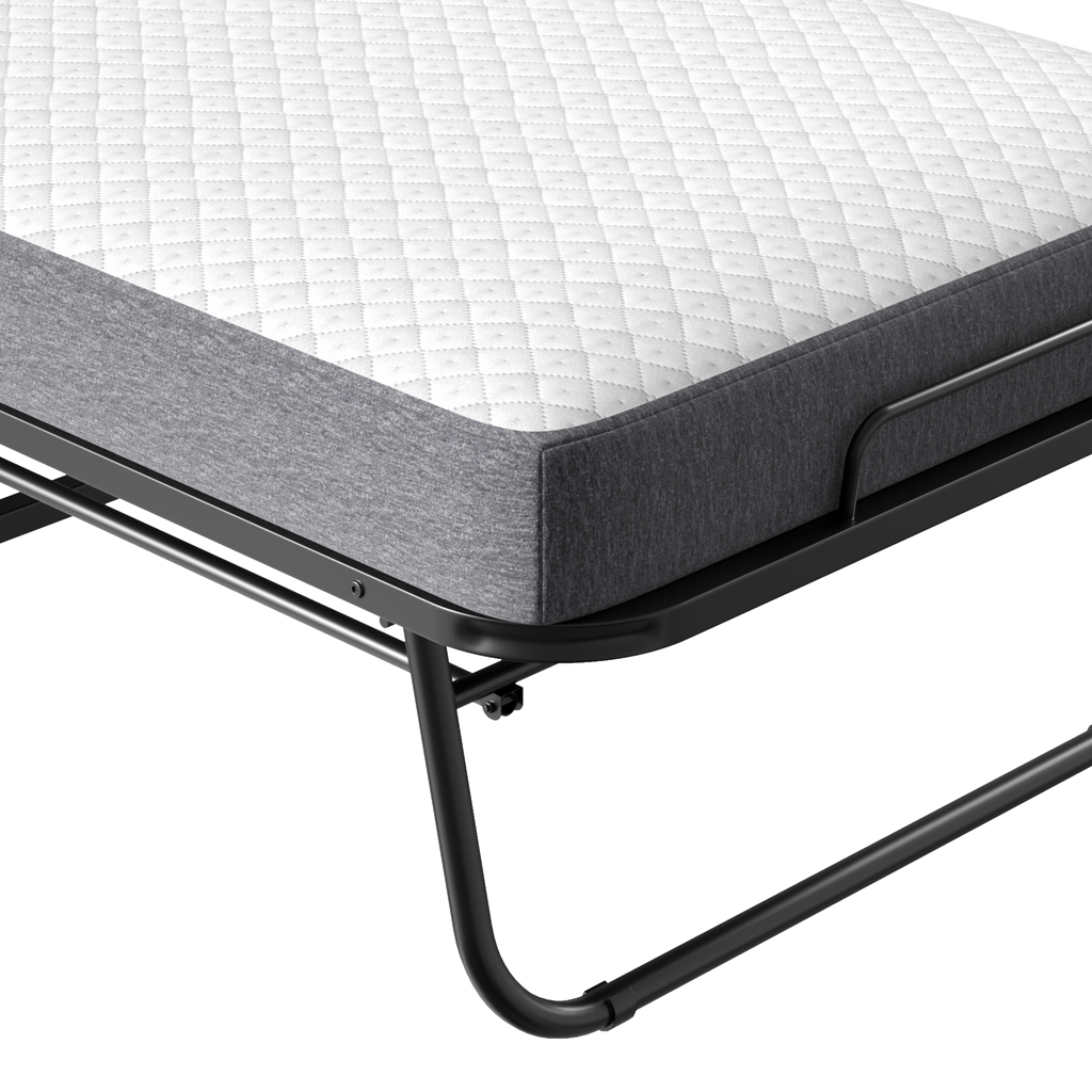 • 5 Inch Luxurious Mattress:This folding bed with mattress made of 1.5' memory foam, 3.5' high-density support foam.Soft and comfortable, reduce fatigue, provide a nice sleep. The zippered mattress cover is made of soft polyester, which is breathable and skin-friendly, removable and washable, easy to clean.