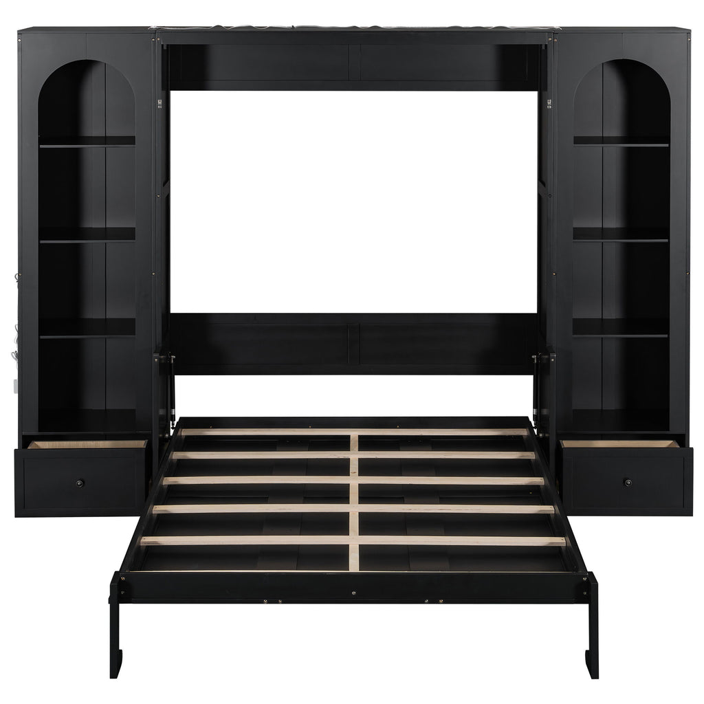 Queen Size Murphy Platform Bed With Shelf, Side Cabinets, Drawers And LED - Black