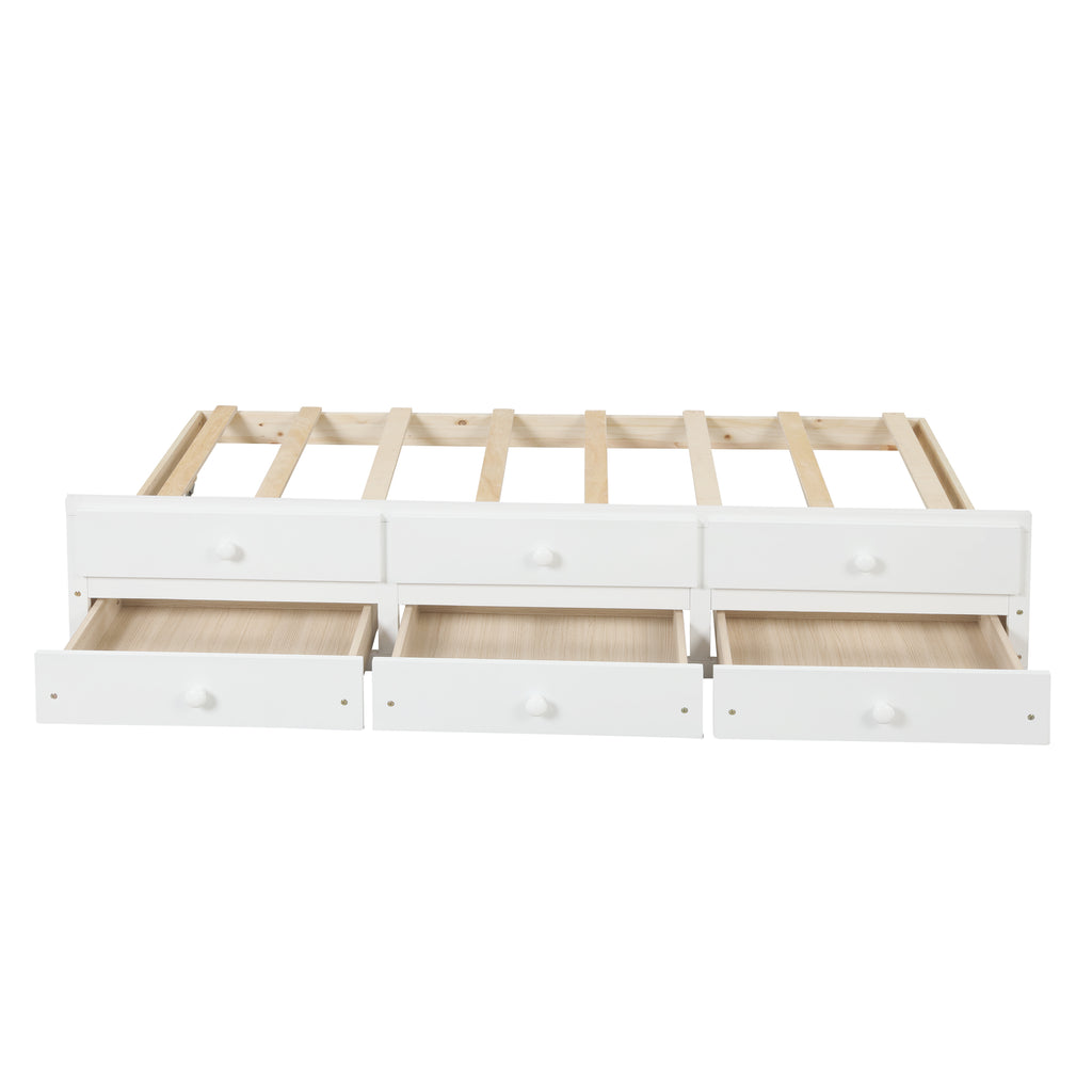 - [Pull-Out Trundle and Drawers for Guest] Trundle can be the key formula to generate unforgettable memories with your overnight guest. The withdrawal of the twin trundle and 3-drawers can be conducted effortlessly, creating a separate bed and convenient storage space for your guest, establishing a comfortable and exhilarating experience during their staycation.