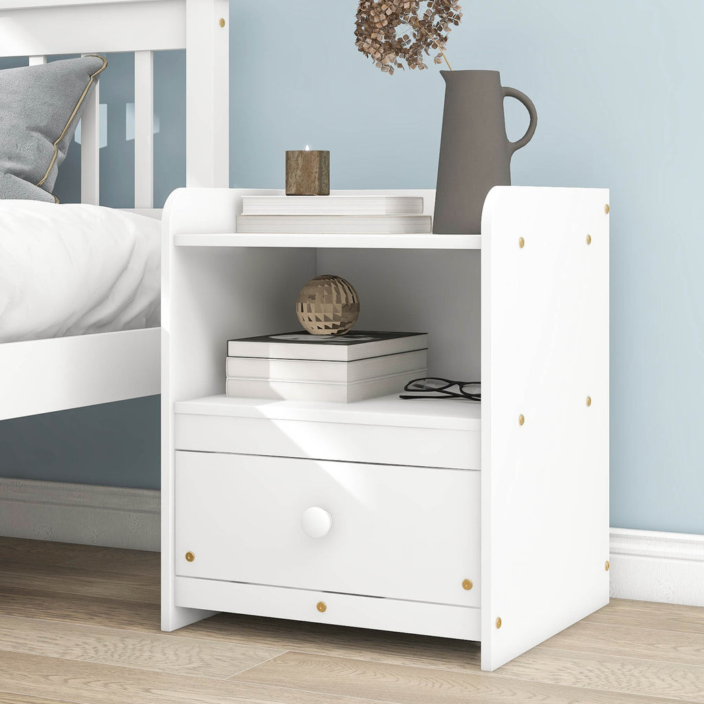 - [Selected Nightstand] The nightstand matches this full bed perfectly. You can put a lamp, an alarm-clock and favorite books on the nightstand top for your accessibility . The design of storage cabinet and drawer keeps the room neat and tidy, fully explores the options to optimize space-saving. The nightstand also offers you to use it as a tea/coffee table ,bookcase or storage space.