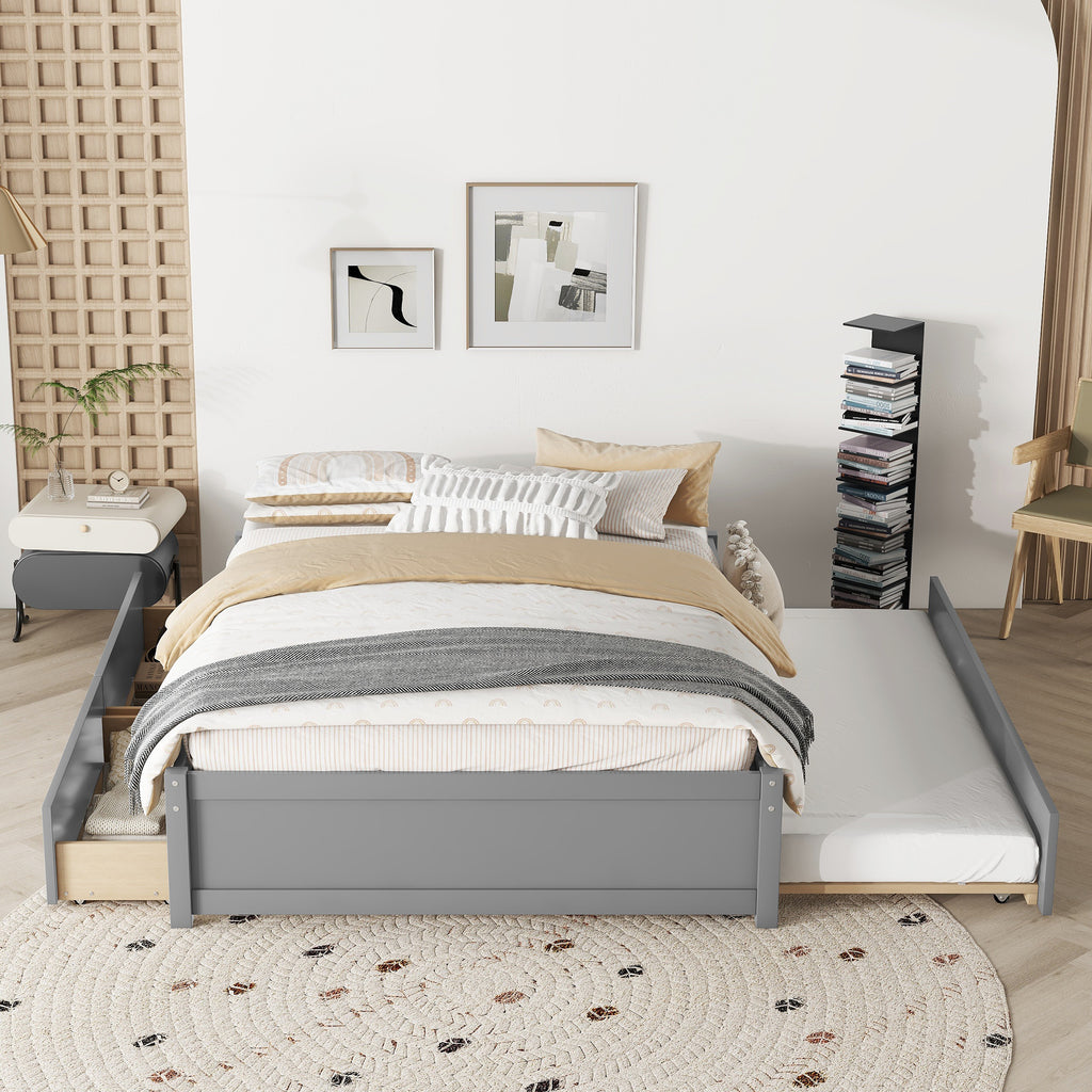 - [Space-saving]: The bed features 2 drawers and trundle bed underneath two sides, perfect for storing and organizing bedding, clothes, or seasonal items in the unused space under the bed. Drawers have casters for easy in and out storage.