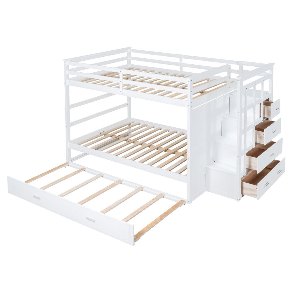 Full Over Full Bunk Bed with Trundle and Staircase, White